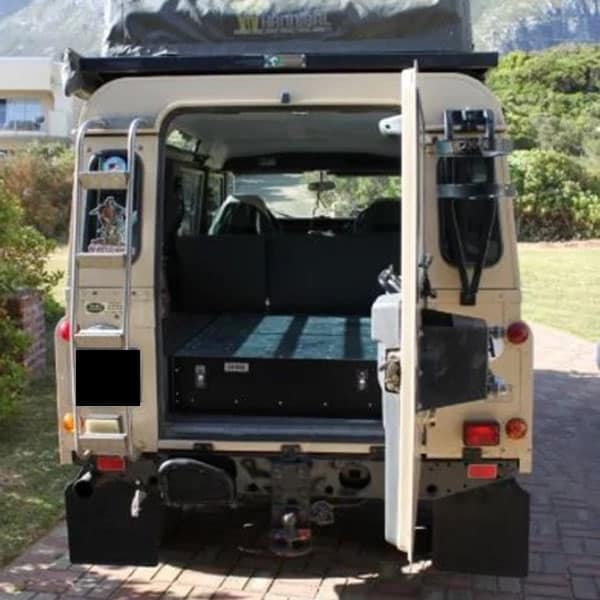 Land Rover Defender draw systems for defender 90 and 110 (Pre 2007). 1.6mm Galvanised Steel construction which is painted black and carpeted inside and on top.