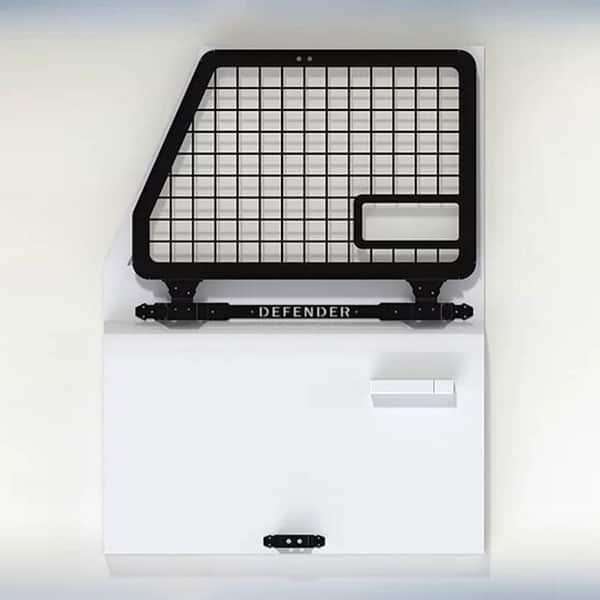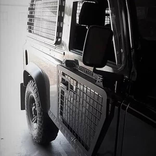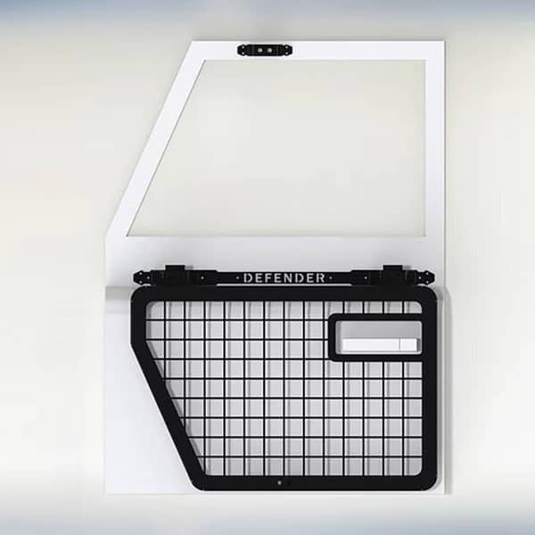 Window Cage set for the front doors of a Land Rover Defender 90/110/130 designed and made by X Axle. The Cages will fold completely up and down with space to add padlocks. The Cages allow the occupants to safely sleep in a vehicle with the windows open and allows the owner to lock the car up completely if it is being stored in an unsafe location. Heavy-duty Aluminium billet hinges with powder-coated mild steel products make this a heavy-duty application that will be durable.
