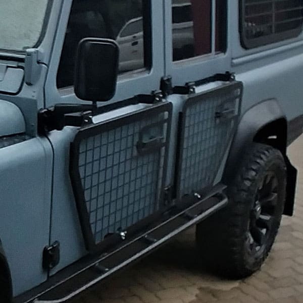 Window Cage Set for the Rear doors of a Land Rover Defender 110 and 130 designed and made by X Axle. The Cages will fold completely up and down with space to add padlocks to safely lock the Cages onto the car. The Cages allow the occupants to safely sleep in a vehicle with the windows open and allows the owner to lock the car up completely if it is being stored in an unsafe location. Heavy-duty aluminium billet hinges with powder-coated steel Cages cut and bent from a single sheet of steel make these Cages strong and durable.