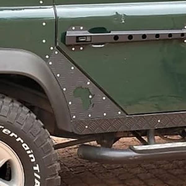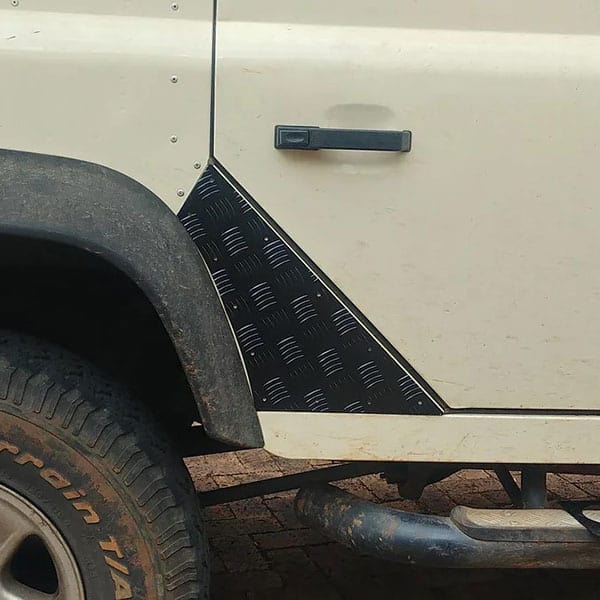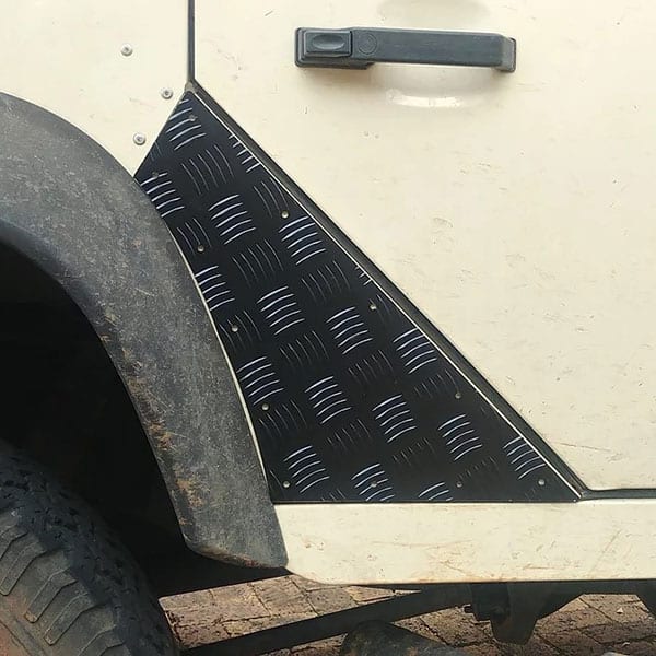 Fit the new Land Rover Defender Rear Door C-Panel Protectors, made from a 2mm Aluminium vastrap/checker plate, to the rear of your Landy 110 5-door, under the rear doors. This vastrap protects the Landy from scuffs of passengers entering and exiting the vehicle and gives your Land Rover the hardened bush protection look!